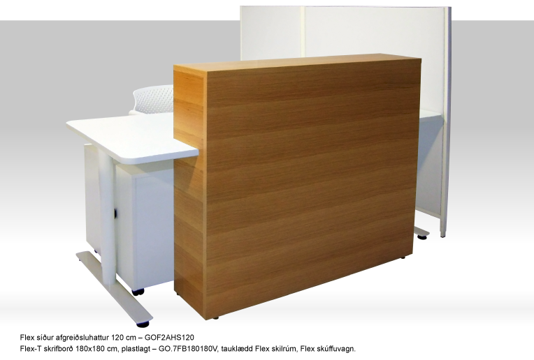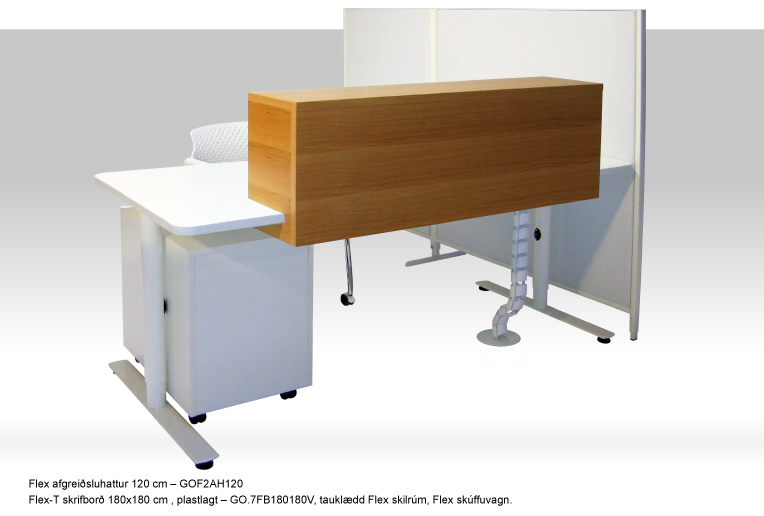 Flex2 afgreiðsluborðin má nota sjálfstæð eða með Flex-T og Flex3 skrifborð. Þau fást með eða án plexíglersframplötu og ljósabúnaðar.